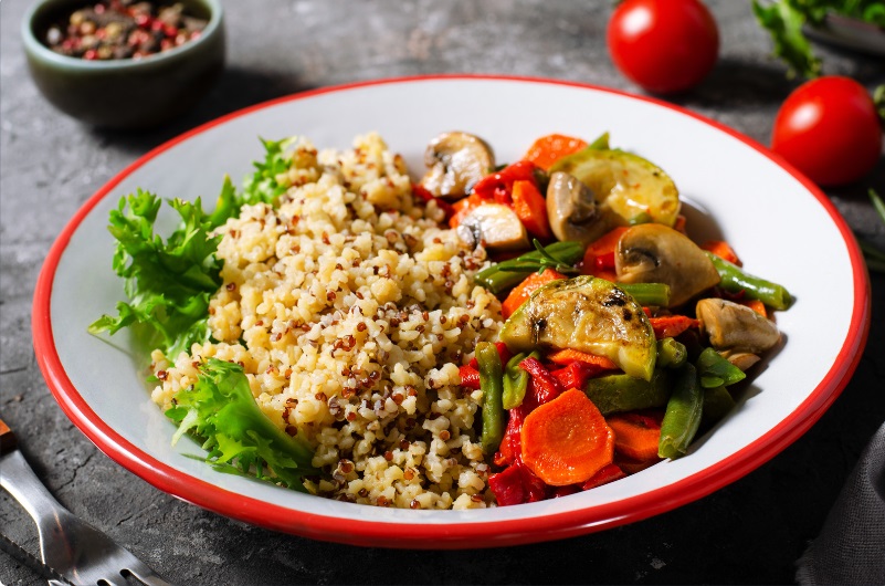 תבשיל קינואה לבנה ואדומה בליווי ירקות מאודים פריכים
