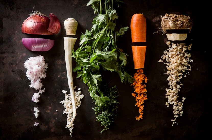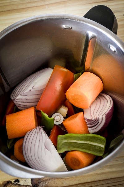 6 מנות החומרים: 2 בצלים סגולים קלופים וחתוכים לרבעים 3 גזרים קלופים וחתוכים למקטעים של 4 ס"מ 6 גבעולי סלרי חתוכים למקטעים של 4 ס"מ 6 שיני שום קלופות 5 ס"מ שורש ג'ינג'ר קלוף 3 גבעולי למון-גראס, החלק התחתון 1/2 פלפל צ'ילי אדום טרי (או לפי הטעם) 1 שורש סלרי קלוף וחתוך לקוביות של 2 […]