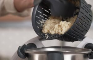 - מוסיפים לקערה את יתרת המים/ציר הירקות, עד לסימון העליון של קערת התרמומיקס, את המלח ומבשלים 5 דקות/ 100 מעלות/ נגד כיוון הלהב / מהירות בחישה עדינה.