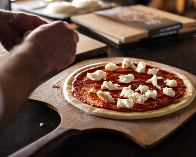 - מניחים 2 כפות (כ-60 גרם) רוטב עגבניות במרכז עיגול הבצק ומורחים אותו בתנועות מעגליות על גבי כל הבצק, משאירים 2 ס”מ של שוליים ללא רוטב. מפזרים מעל רוטב העגבניות קרעים של כדור מוצרלה, 20 גרם אנשובי ורבע כוס זיתים.